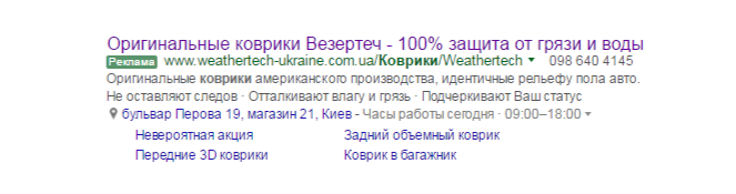 - используйте максимально широкие объявления — то есть дополнительные описания, ссылки на другие важные разделы вашего сайта (это могут быть разделы дополнительных услуг или товаров, акции, программы лояльности и т.п.), физический адрес компании.