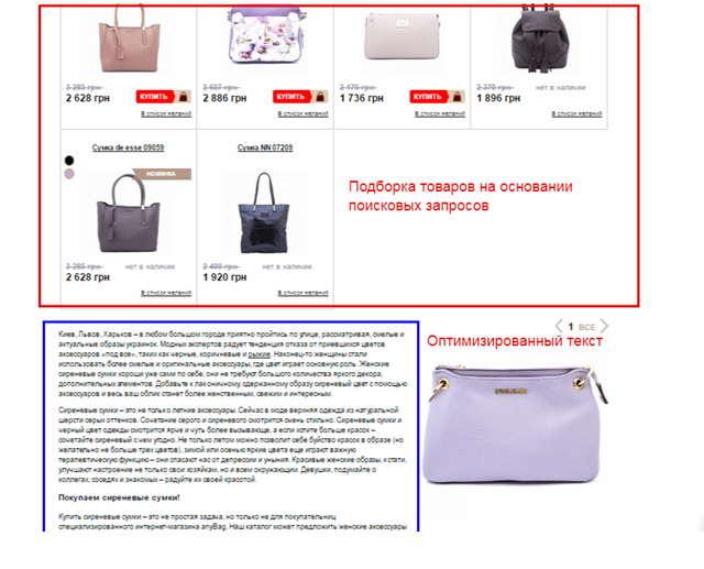 Пример, как нельзя делать: «купить замшевую сумку киев, цена, доставка».