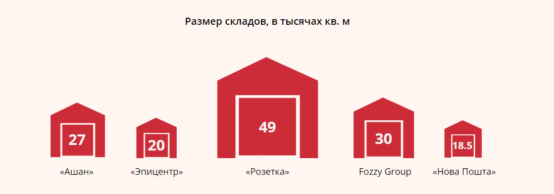 В январе 2017 года «Розетка» приобрела в Броварах склады класса А общей площадью около 49 000 кв. м, расположенные на участке в 9,5 га в 10 км от Киева и 15 км от международного аэропорта «Борисполь». Потраченные на покупку $16 млн — это еще не все. «В два раза больше, чем мы потратили на склад, мы потратим на его оборудование», — говорит владелец «Розетки». Склад будет автоматизированным. Размер и оснащение делают его едва ли не уникальным в Украине. Для сравнения, размер складов сети «Ашан» в Киевской области — 27 000 кв. м, у «Эпицентра» склад на 20 000 кв. м в пгт Калиновка. Fozzy Group пользуется собственным распределительным центром площадью 30 000 кв. м (хотя общие складские площади группы превышают 100 000 кв. м), а фулфилмент-площади «Новой Почты» — два склада в Броварах и Белгородке — достигают 18 500 кв. м. По словам Чечеткина, логистика является сегодня наиболее затратной частью бюджета компании: на нее тратится около $1,5 млн ежемесячно.