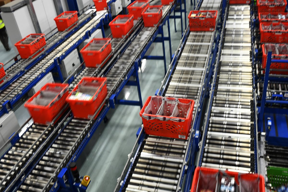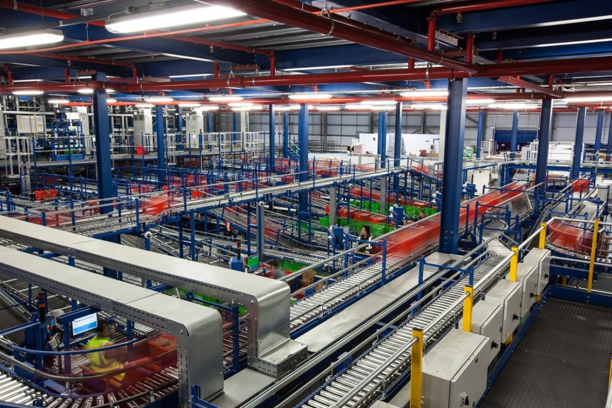Они оснащены автоматизированными конвейерными лентами, кранами, шаттлами и другими машинами, которые транспортируют оранжевые пластмассовые контейнеры по территории склада на высоких скоростях.