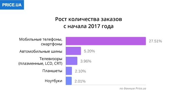 Самыми популярными категориями в первом квартале 2017 года с большим отрывом стали «Мобильные телефоны, смартфоны» — более 27%, «Автомобильные шины» — 5,2%, «Телевизоры» — почти 4%, а также «Планшеты и ноутбуки» — по 2%.
