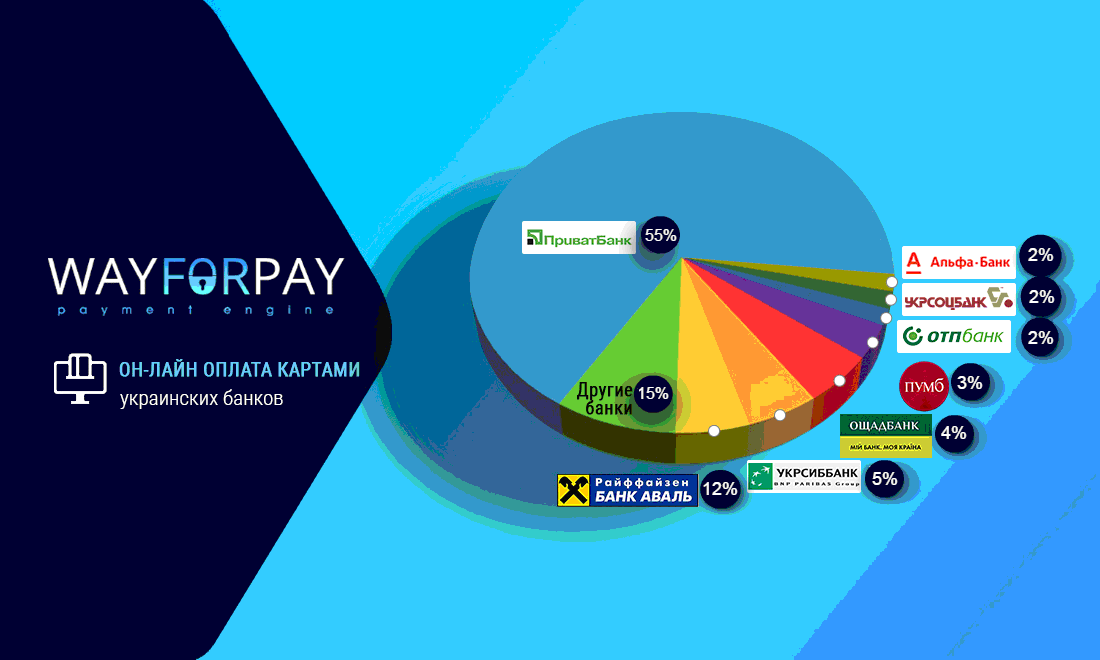По данным WayForPay, при оплате картами онлайн ситуация практически схожа. Лидирующие позиции занимает «ПриватБанк» — около 55%. На втором месте «Райффайзен Банк Аваль» — 12%, и около 5% оплат происходит картами «УкрсибБанка». Карты «Ощадбанка» в онлайне занимают всего до 4%.
