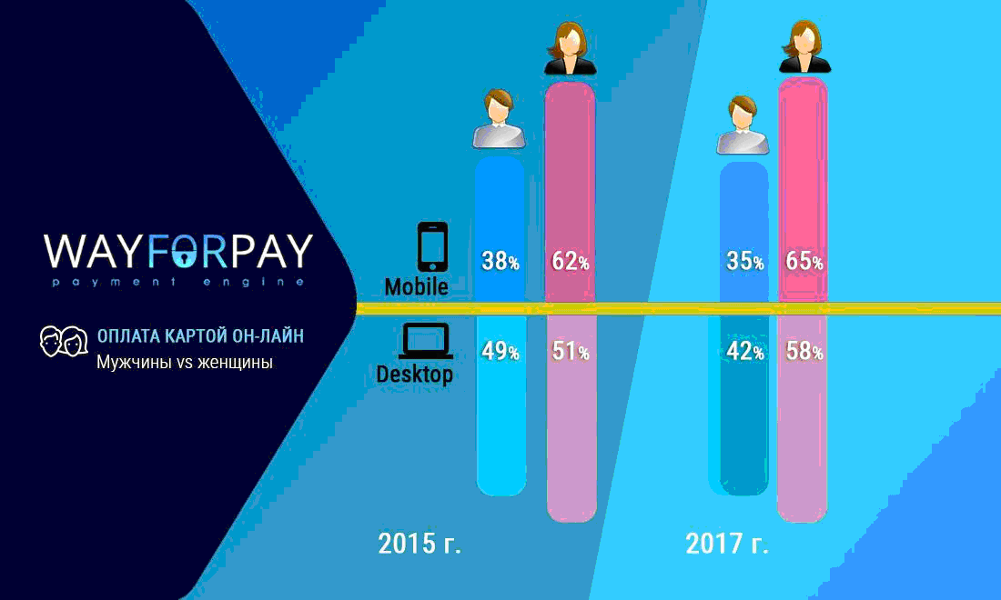 В марте 2017 года, по данным WayForPay, около 58% всех оплат было произведено женщинами, 42% — мужчинами. По сравнению с данными 2015 года, при оплате с десктопов аудитории были практически равными. Также на женскую часть населения приходится около 65% оплат с мобильных устройств.