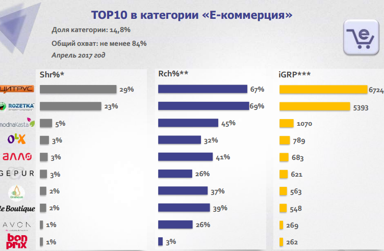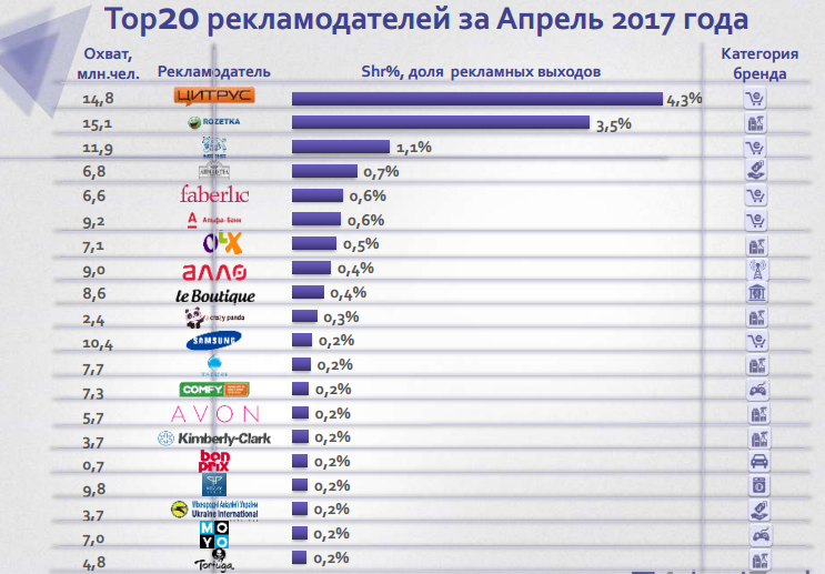На первом месте среди крупнейших рекламодателей онлайн-гипермаркет «Цитрус» с охватом аудитории 14,8 млн человек, занимающий долю 4,3% рекламных выходов.