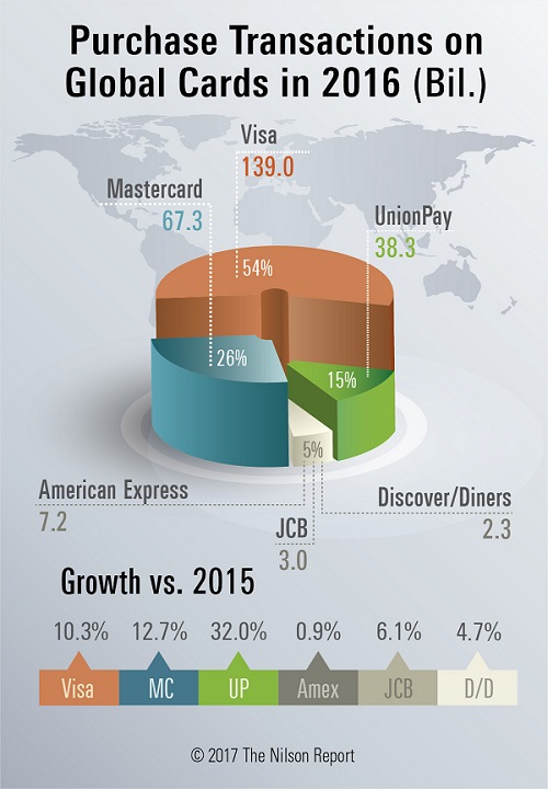 В 2016 году количество карт Visa увеличилось на 141,4 млн (рост на 4,8%), MasterCard стало больше на 136,9 млн (рост на 8,9%). В то же время уменьшилось число карт American Express — на 7,9 млн штук (снижение на 6,7%) и Diners Club/Discover — на 1 млн (1,7%).