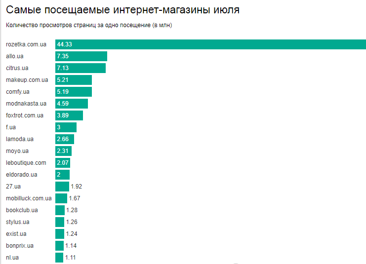 Rozetka повысила количество посещений по сравнению с июнем на 1%, до 44,33 млн, allo.ua сохранил второе место, увеличив посещаемость на 3%, до 7,35 млн заходов. На третьем месте Citrus.ua, у которого в июле посещаемость выросла на 6%, до 7,13 млн.
