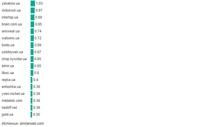 О рейтинге: Рейтинг составляется на основе открытых данных сервиса SimilarWeb. В рейтинг крупнейших интернет-магазинов попадают любые интернет-магазины, зарегистрированные в Украине, с ежемесячной посещаемостью не менее 300 000. Если вы знаете о таком магазине и не видите его в рейтинге, то напишите его название нам в редакцию по адресу: shokun@retailers.ua.