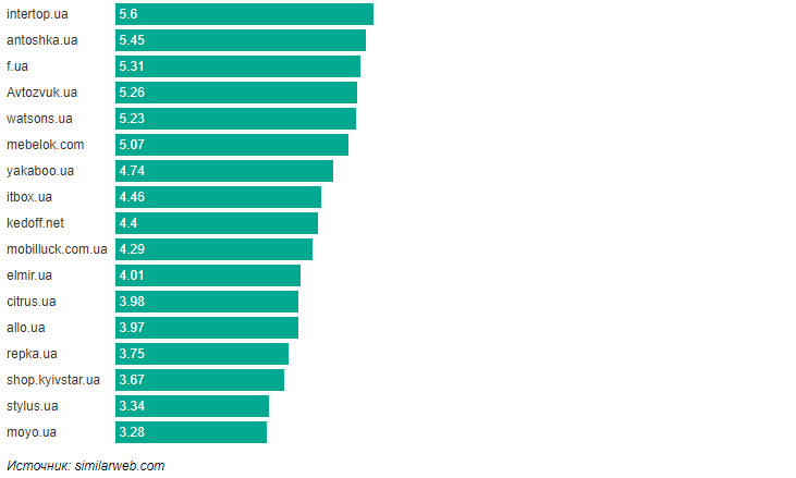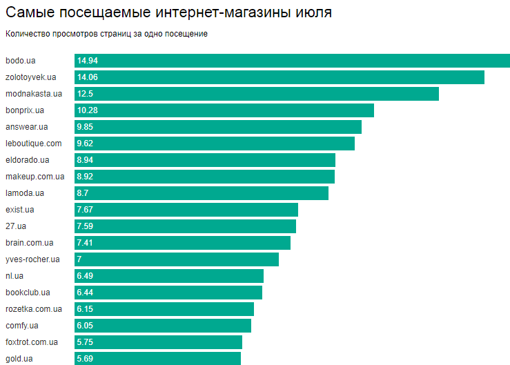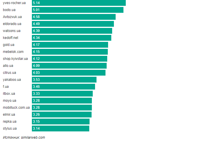 Первое место по времени, проводимому пользователями на сайте, занимает leboutique.com.ua с показателем 10,01 мин. Bodo.ua лидирует по количеству просматриваемых за одно посещение страниц — 15.