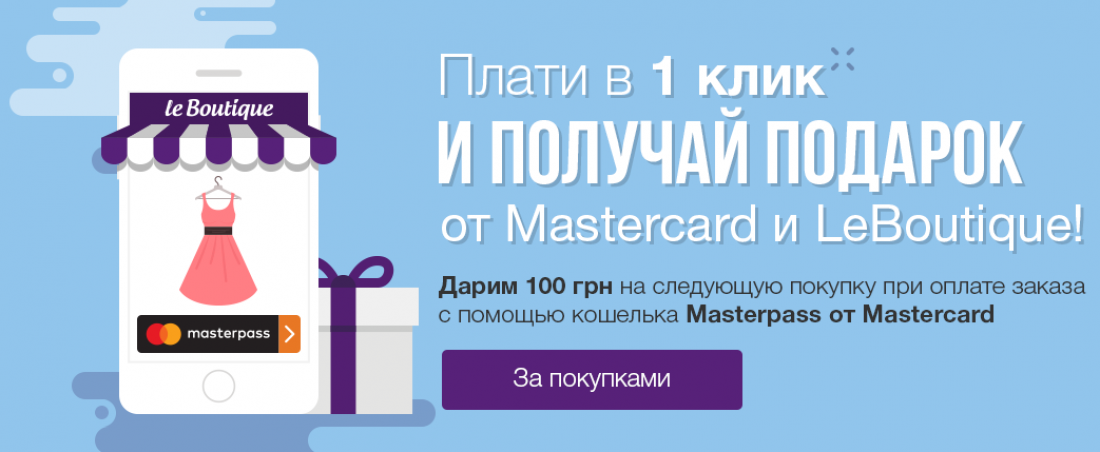 По случаю запуска нового платежного решения на сайте и в мобильном приложении онлайн-магазина LeBoutique и Mastercard дарят пользователям 100 грн на следующую покупку при условии оплаты заказа с Masterpass.