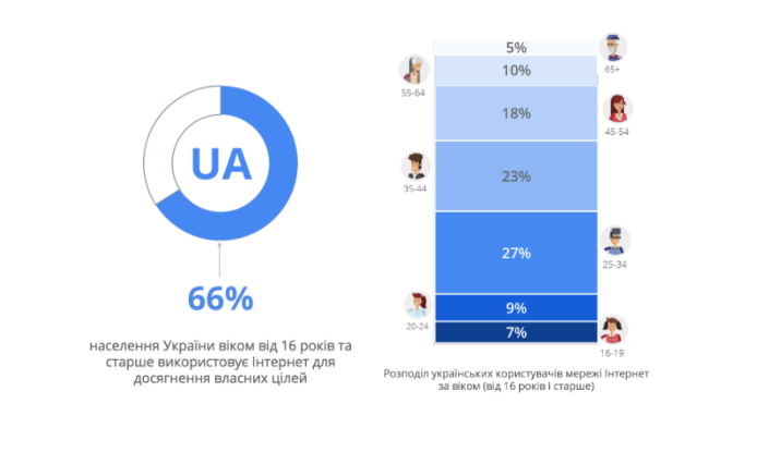 Исследование показало, что 66% украинцев регулярно пользуются интернетом для личных целей. Для сравнения, на глобальном уровне эта цифра составляет 82%. Самые активные пользователи в возрасте 25-34 и 35-44 лет (27% и 23% соответственно). Однако, вопреки предположениям про молодой возраст онлайн-пользователей, распределение использования Интернета по возрастным группам достаточно равномерно. Интернет ‒ это среда, которая позволяет общаться людям любого возраста.