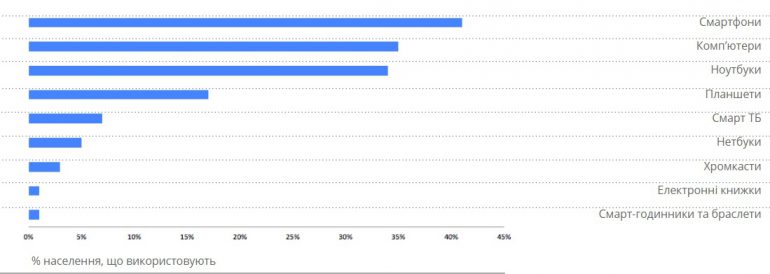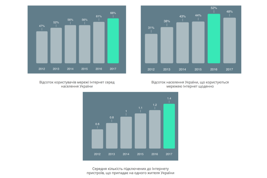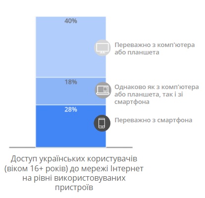 Все больше украинцев выбирают смартфон для пользования интернетом. Так, в 2017 году 18% пользователей одинаково часто использовали как компьютер/планшет, так и смартфон для выхода в Интернет, а для 28% предпочитаемым устройством для выхода в сеть является смартфон.