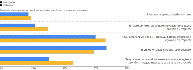 Поведение украинцев в интернете совпадает с глобальными тенденциями. Так, украинские онлайн-пользователи в первую очередь развлекаются (82%), ищут в Интернете информацию (74%) и выполняют поставленные задачи онлайн (38%), а также размещают онлайн-контент (22%), помогают другим, показывая, как что-то сделать онлайн (27%).