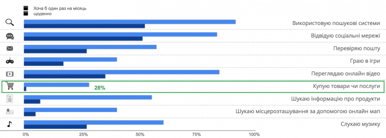 Хотя бы один раз в месяц украинцы ищут информацию о товарах и продуктах (55% пользователей), используют карты для определения местоположения или составления маршрута (40% пользователей), а также осуществляют покупки в Интернете (28% пользователей). Самыми же популярными онлайн-активностями являются: использование поисковых систем (91%), социальных сетей (83%) и просмотр видео онлайн (84%).