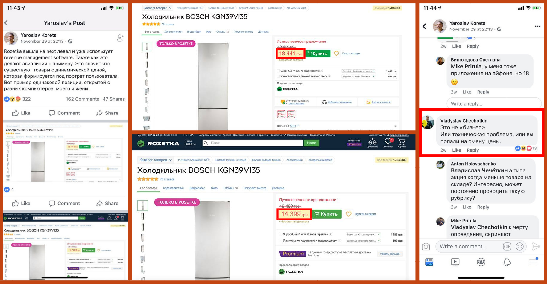 Пользователи по всему миру периодически публикуют информацию, что столкнулись с персональными ценообразованием. В Украине, к примеру, в конце ноября пользователь Ярослав Корей, один из лидеров украинского движения Burning Man и у которого в друзьях чуть больше 4 600 людей и 1 300 подписчиков, написал пост в Facebook, что Rozetka формирует цену под портрет пользователя. В качестве доказательства он привел скриншоты, одинакового товара – холодильника Bosh, но с разными ценами. На одном, по словам Ярослава, он зашел с компьютера жены – MacBook Pro, на другом со своего компьютера – MacBook Air. "Мы оба авторизированы. Персональной скидки ни у кого нет", – подчеркнул Ярослав. В итоге разница в стоимости составила 4 042 грн.