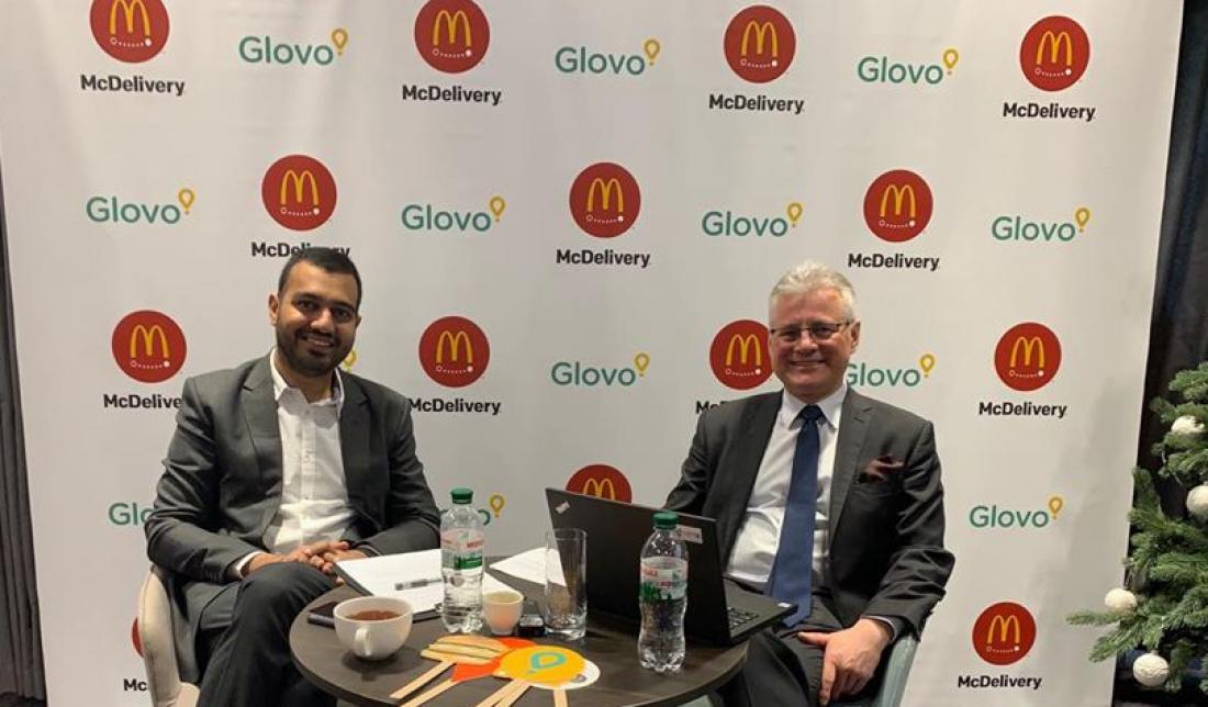Слева направо: директор регионального развития Glovo Утсав Агарваль и гендиректор McDonald's в Украине Гжегож Хмелярский Фото: Людмила Будина