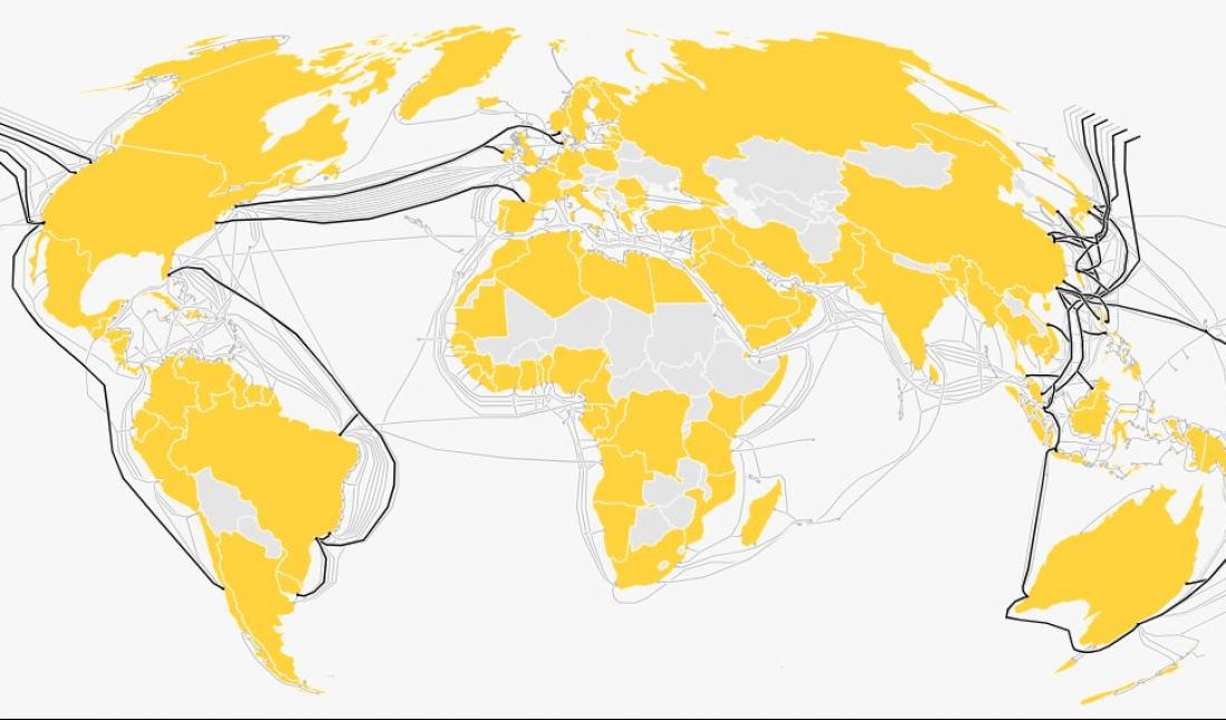 На картинке: черным отмечены кабели Google, Microsoft, Amazon и Facebook, серым – другие кабели. Желтым отмечены страны, к которым подведены кабели. Через подводные кабели проходит 95% трафика.