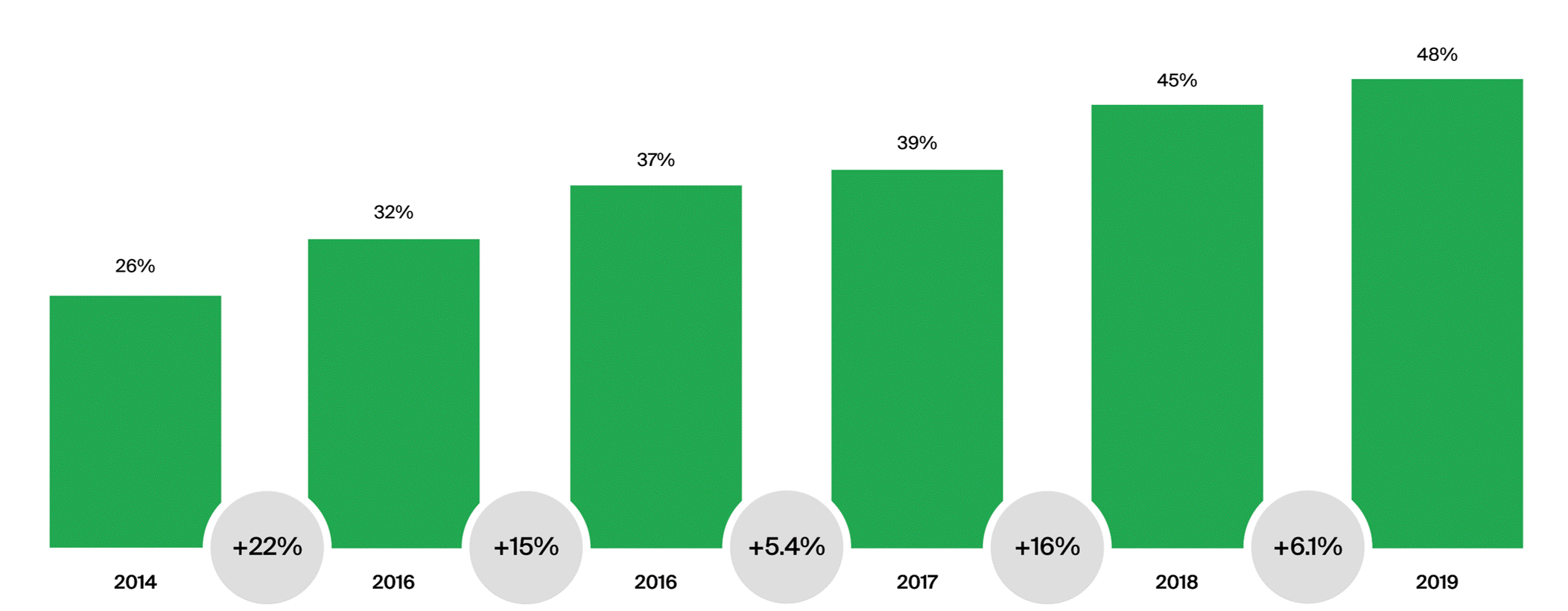 Популярность мессенджеров растет с каждым годом. Cогласно Statista, количество пользователей смартфонов увеличится с 57% до 77% к 2025 году, а к 2020 году количество пользователей мессенджеров достигнет 2,4 млрд.