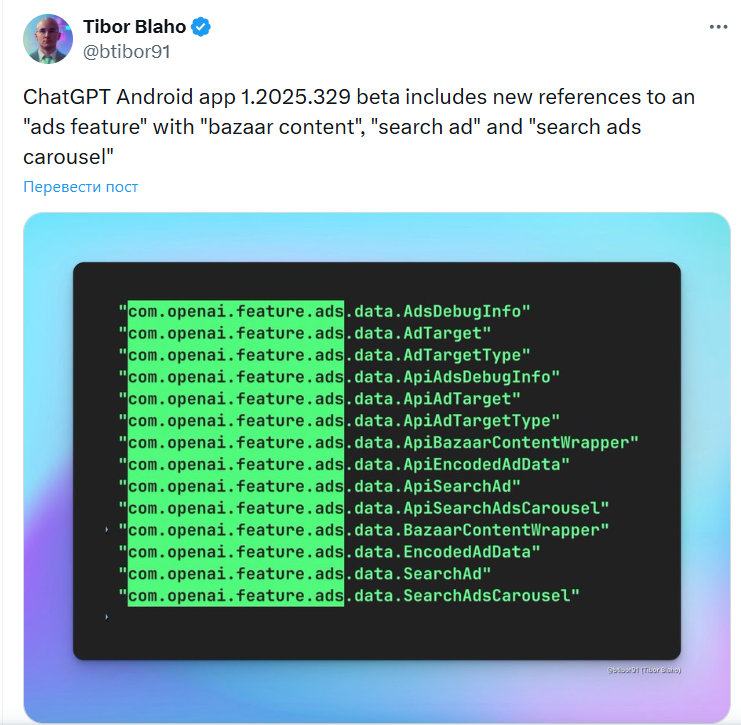У ChatGPT, можливо, незабаром може з'явитися реклама. Австрійський інженер-програміст Тібор Блахо виявив, що бета-версія застосунку ChatGPT для Android містить рядки коду, у яких є згадки про функції реклами.