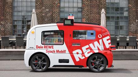 Супермаркет Rewe в Германии тестирует беспилотный магазин на колесах. Он останавливается, когда покупатель машет ему рукой