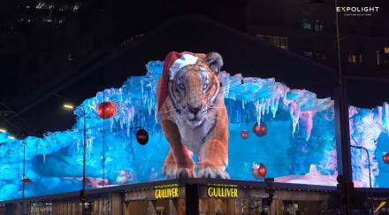 На фасаде ТРЦ Gulliver установили 3D-инсталляцию тигра. Он бросает в зрителей новогодние игрушки