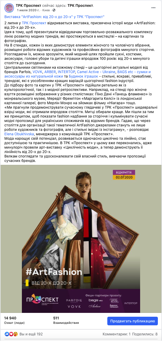 До прикладу, одна публікація в соціальних мережах про знижки чи нову колекцію набирає до 2000 органічних охоплень. Анонс лише самої виставки – в 50 разів більше, і ще тисячі лайків та інших реакцій.