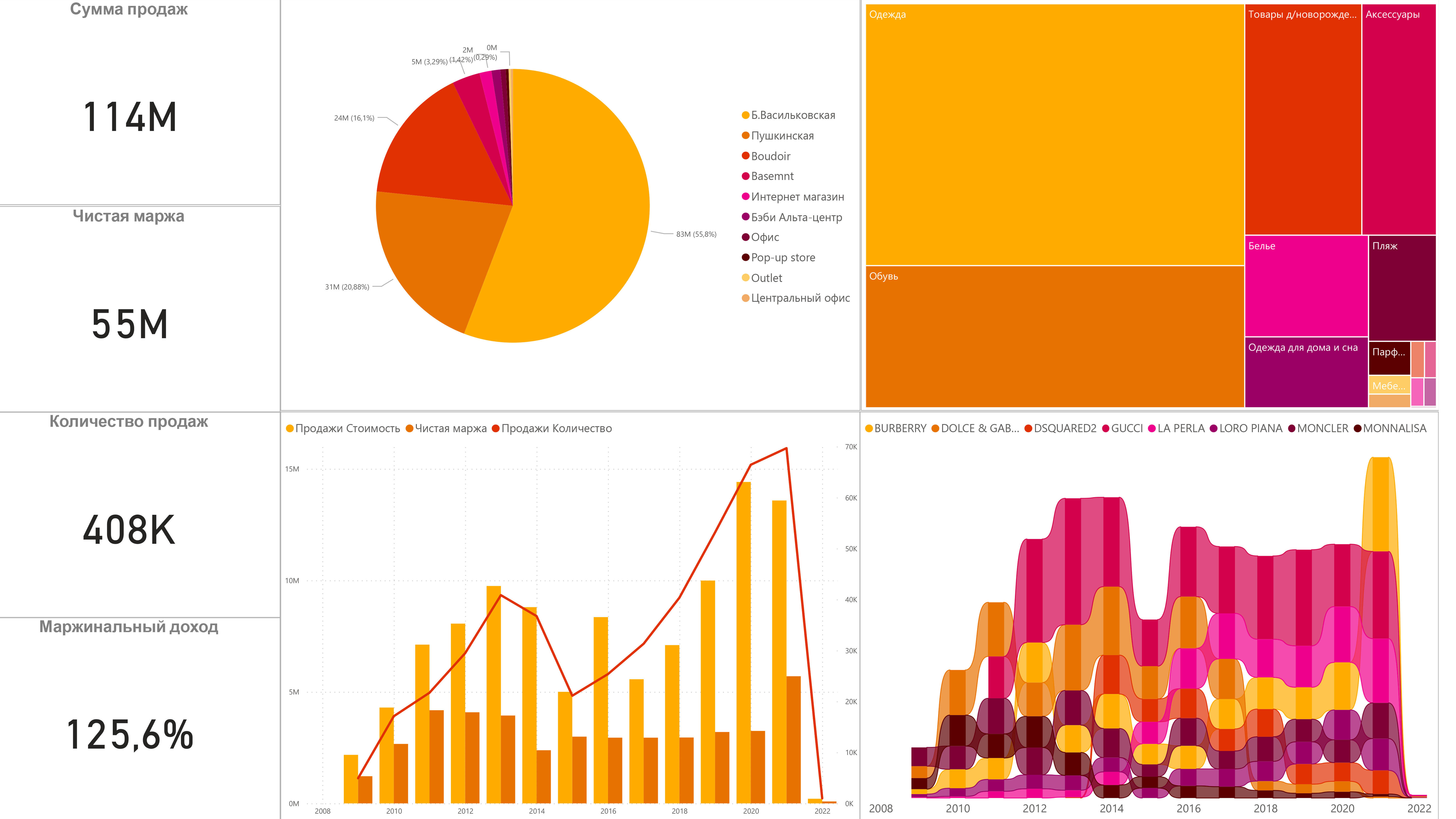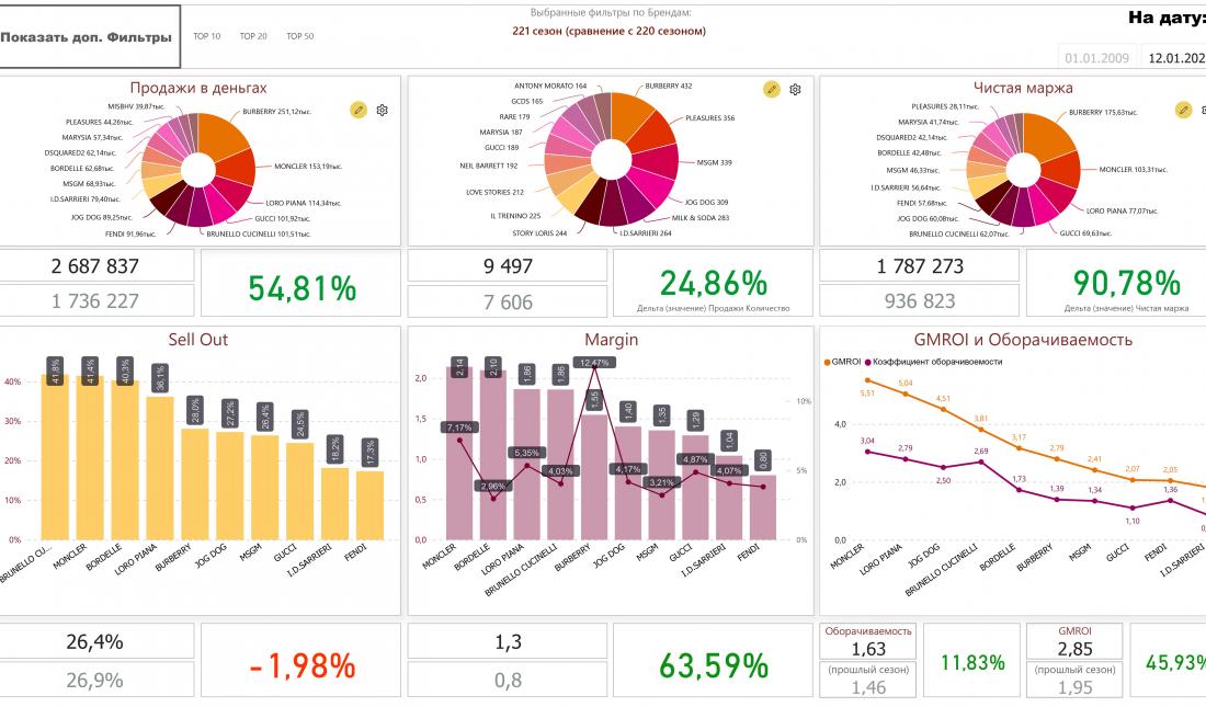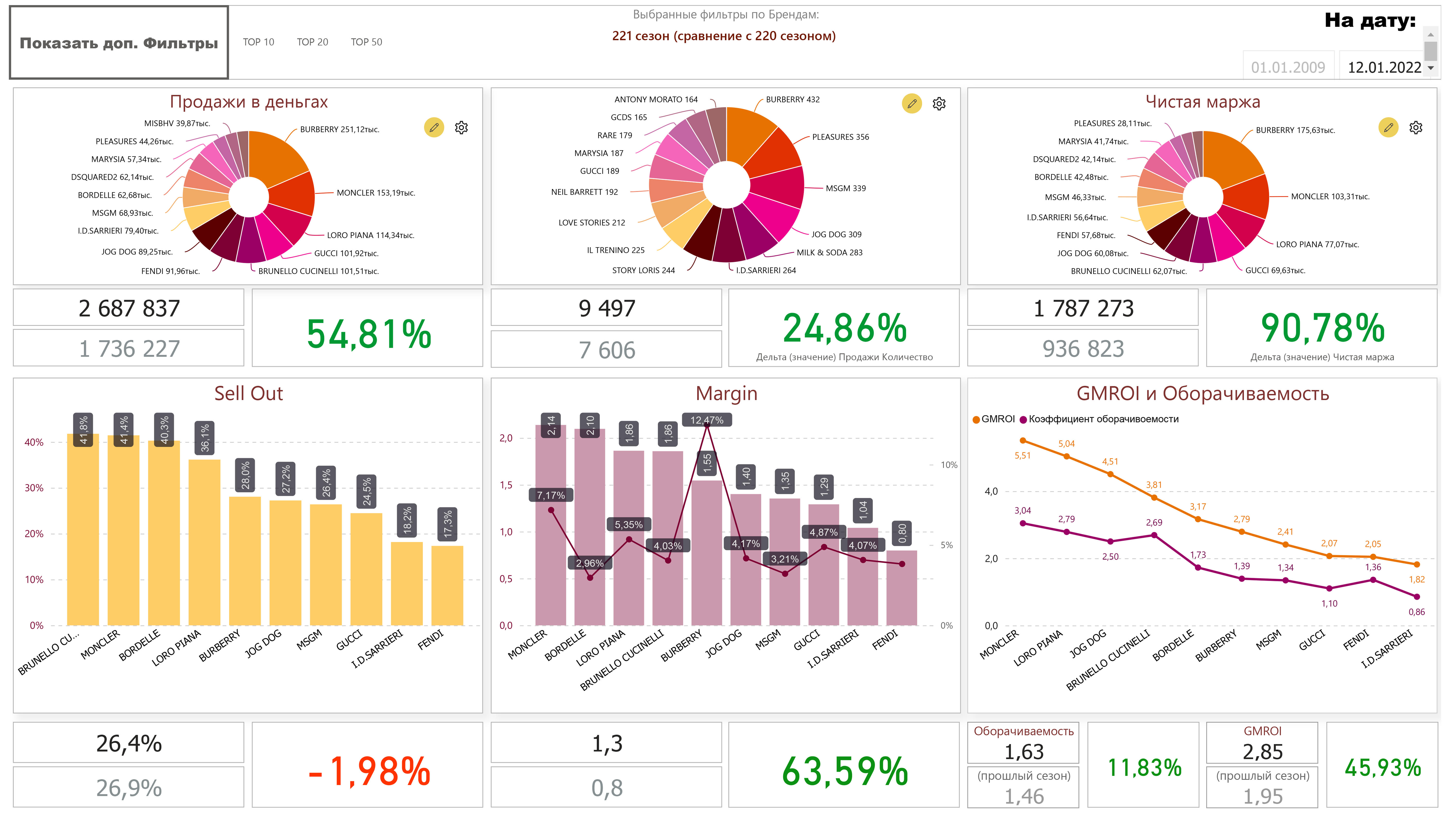 І з цим завданням чудово справляються дашборди. Використовуючи їх дуже зручно порівнювати сезонні показники роботи, виявляти попит на бренди (марки), колекції та окремі моделі товарів, аналізувати результати торгових точок, відділів, продавців, касирів та приймати оперативні рішення щодо подальших напрямків діяльності.